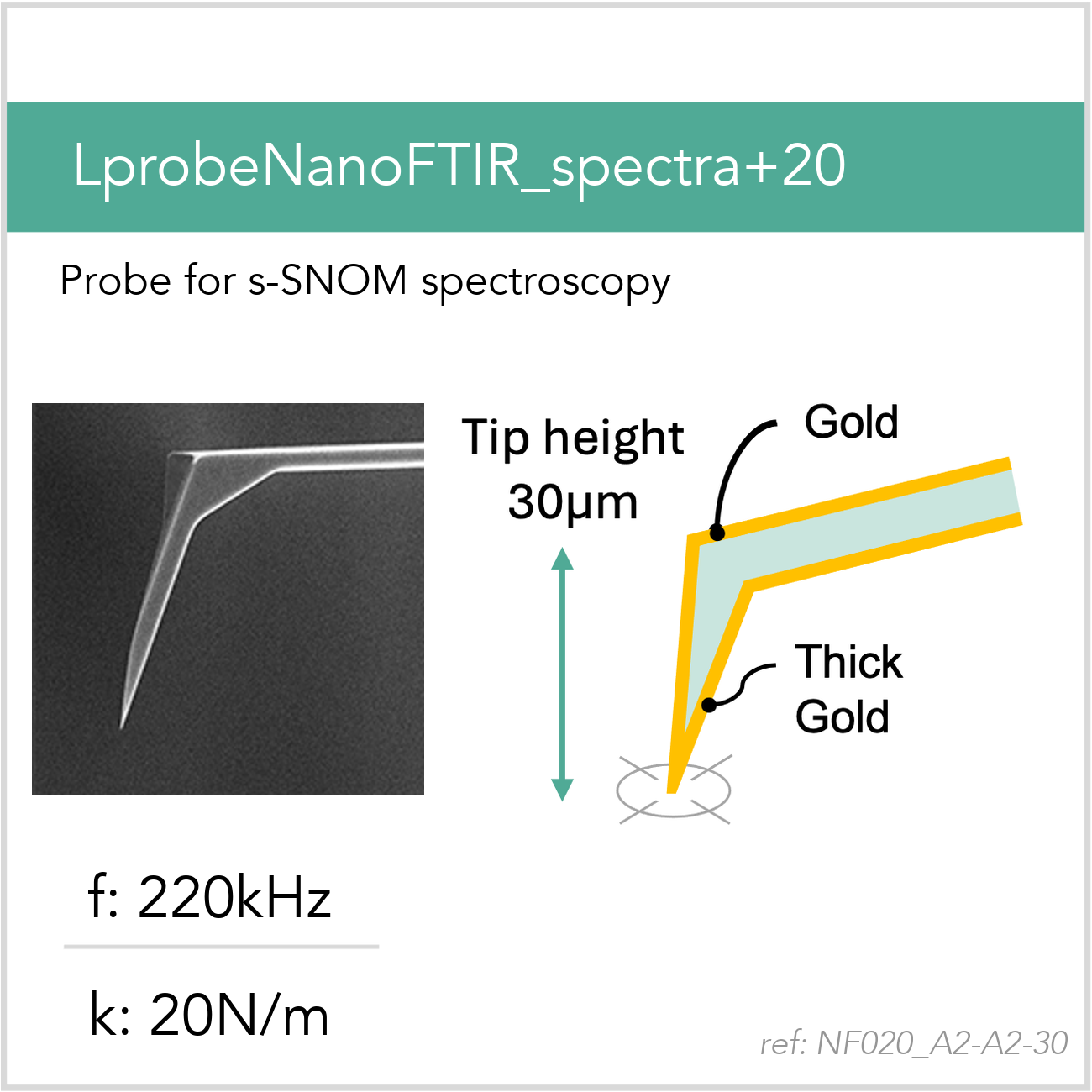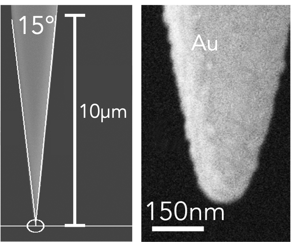 Thick gold layer all faces of the tip, typical apex radius is 75nm. The coating is optimized for s-SNOM spectroscopy.