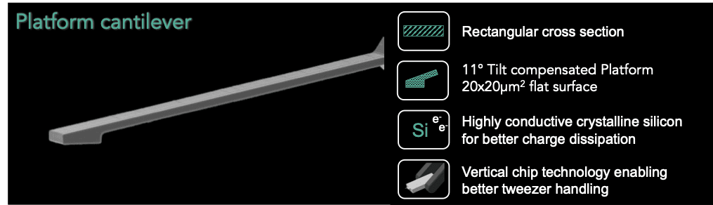 Lprobes are compatible with most SPMs. Our chip is designed with vertical sidewalls that enable safer handling with tweezers.