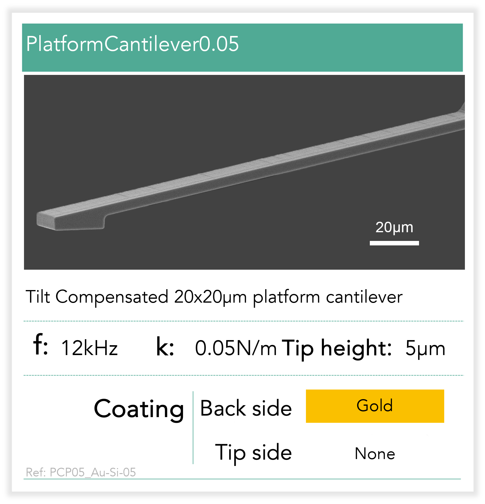 Highly conductive silicon cantilever with a 40nm thick gold coating on the top side, providing optimal laser reflection.