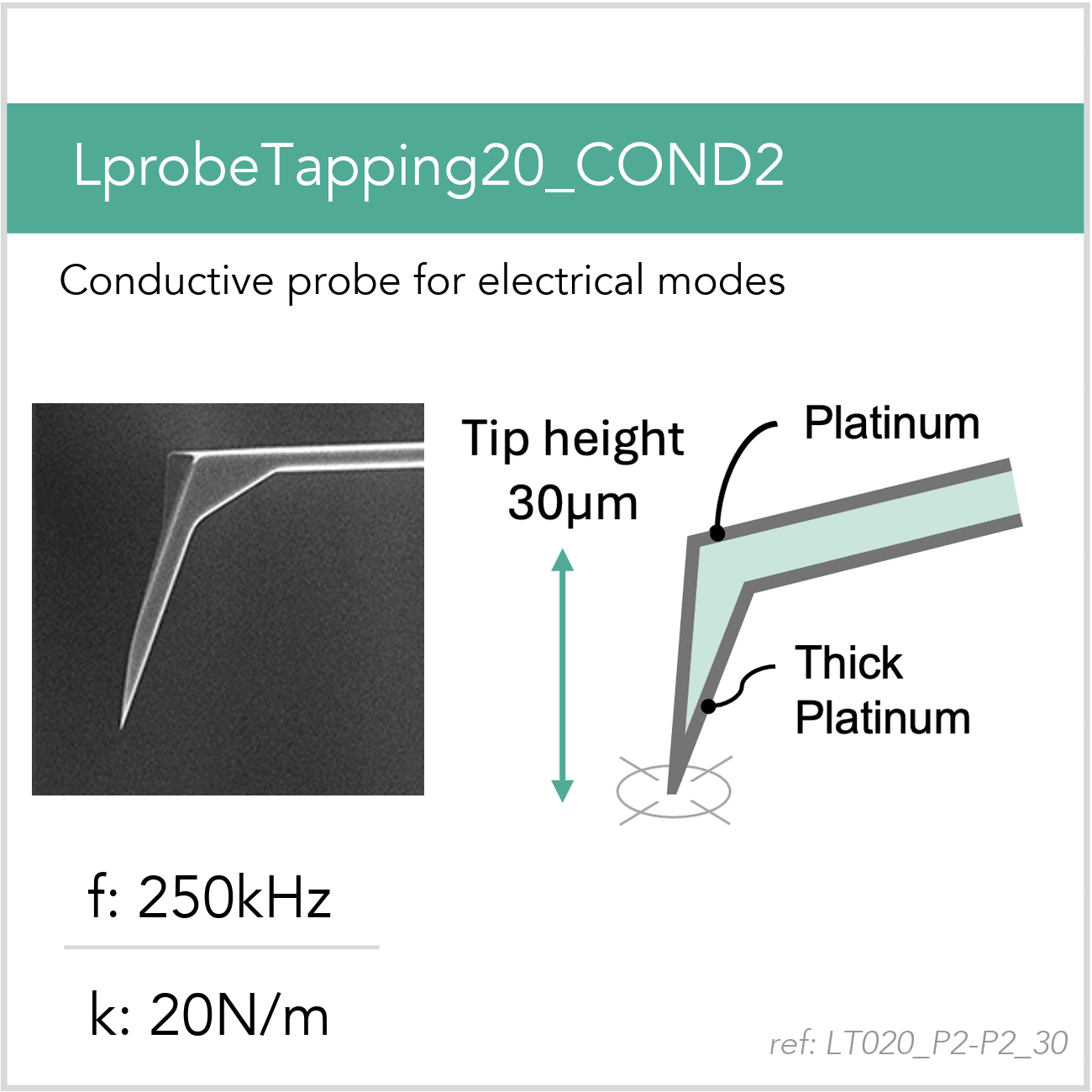 Thick conductive platinum layer all faces of the tip, typical apex radius is 50nm. The coating is optimized for s-SNOM applications.
