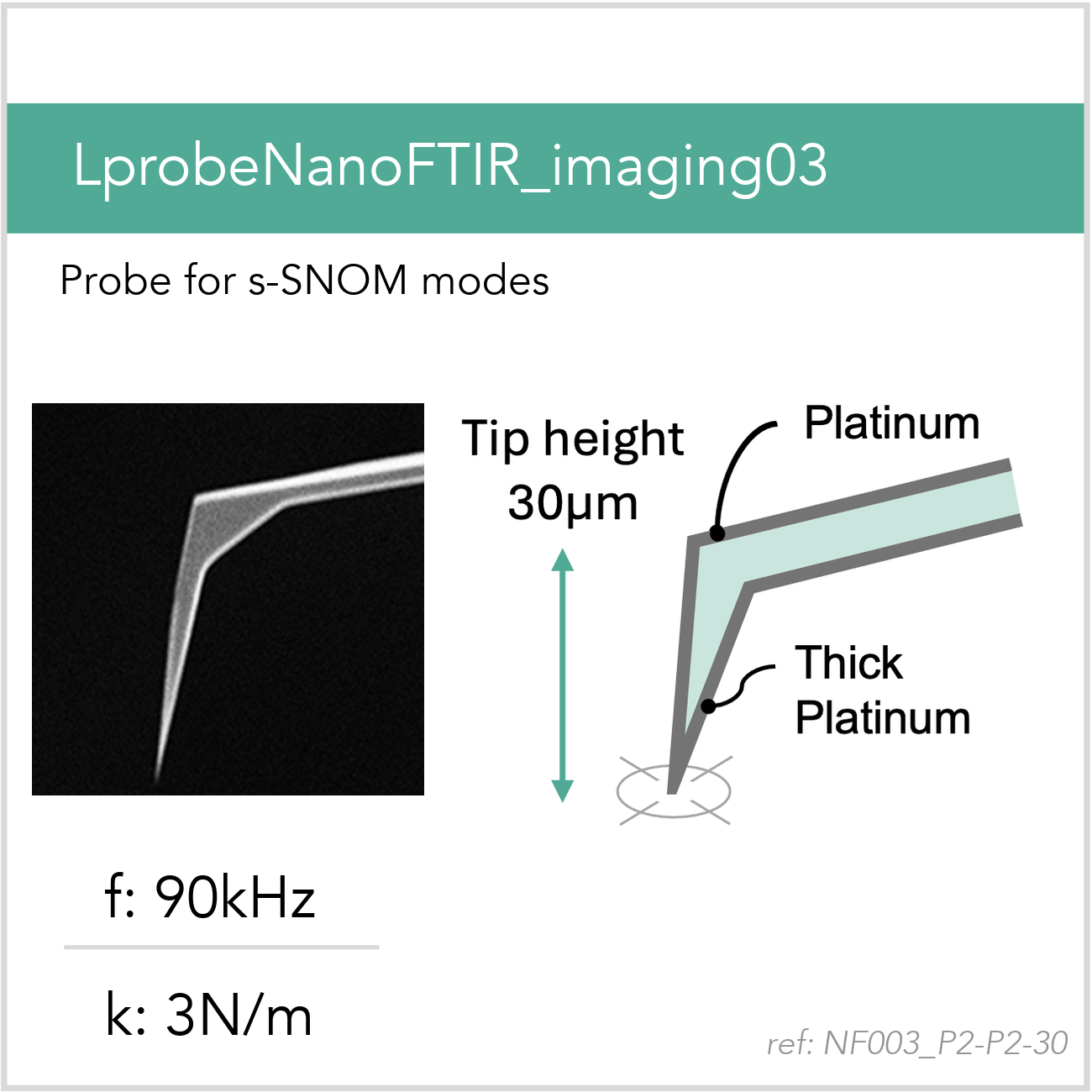Thick conductive platinum layer all faces of the tip, typical apex radius is 50nm. The coating is optimized for s-SNOM applications.
