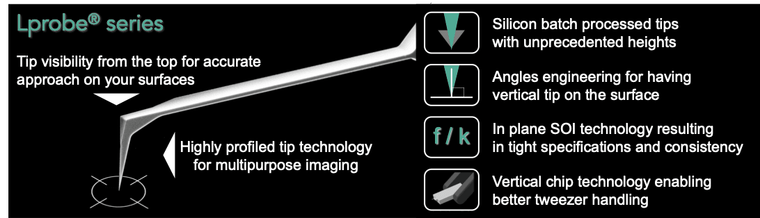 Lprobes are based on a new MEMS patented technology enabling improvements as compared to silicon AFM cantilevers with tip fabricated using mainstream processes developed in the 90’s.
