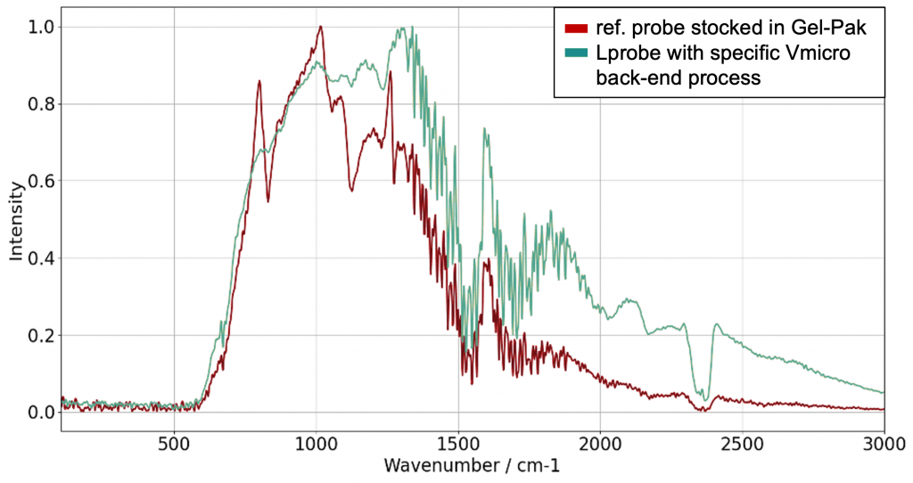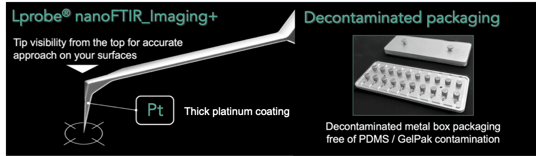 Spectroscopy and images with SNOM tips that have been packaged in standard AFM Gel-Pak boxes can lead to artifacts in the optical response. This is due to contamination of the tip by a few molecules of the gel. Vmicro has developed a back-end process with special decontamination and storage in a metal box. You can select this feature as an option when selecting your reference.