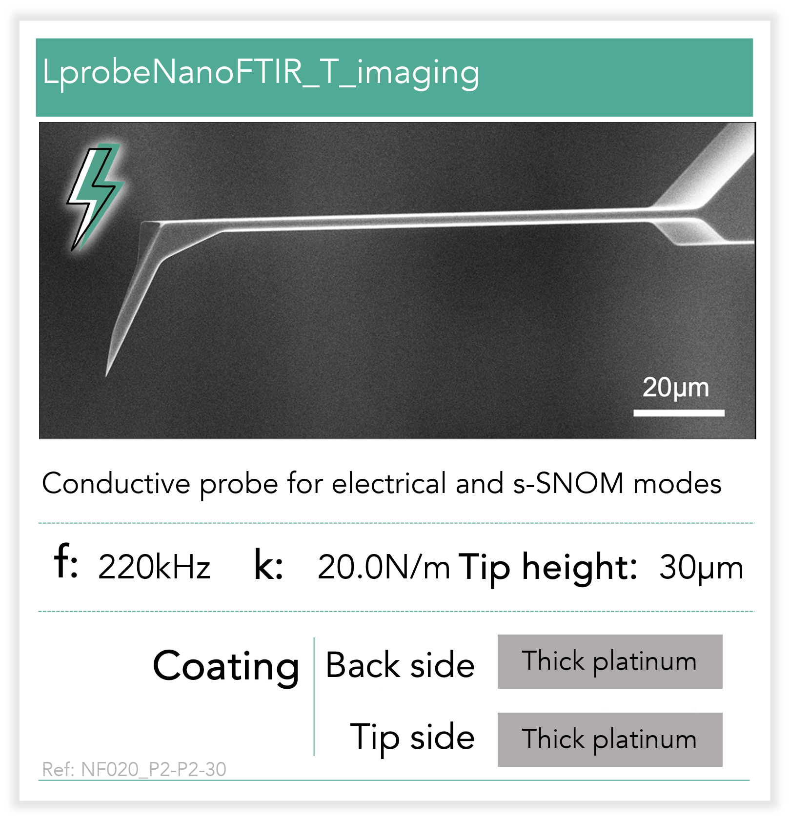 Thick platinum coating on both sides of the cantilever and all faces of the tip, optimized for s-SNOM in the infrared and THz ranges.